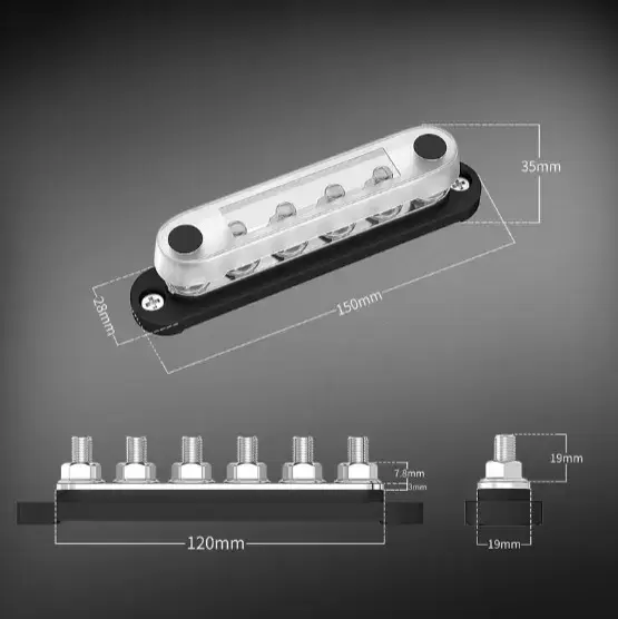 Cada barra colectora de 12v cuenta con 7 pernos de terminal M6 (1/4") y puede soportar un voltaje máximo de 300V CA y 48V CC, con calificaciones de amperaje continuo de hasta 130A CA y 150A CC.