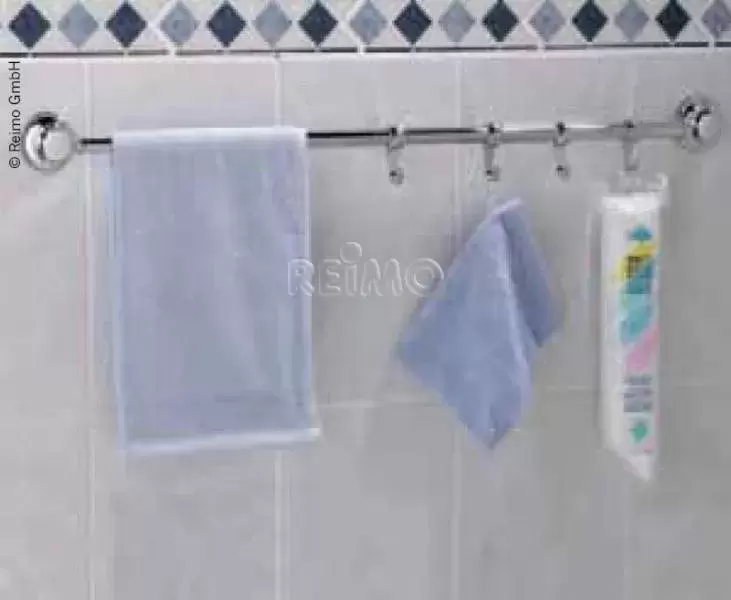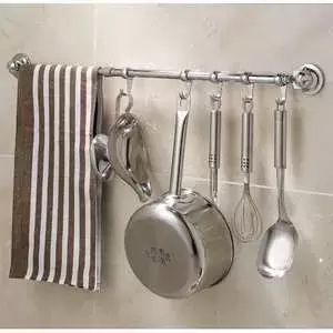 Tira de gancho cromada con 4 ganchos y 2 ventosas para fijación. Longitud de unos 35 cm.