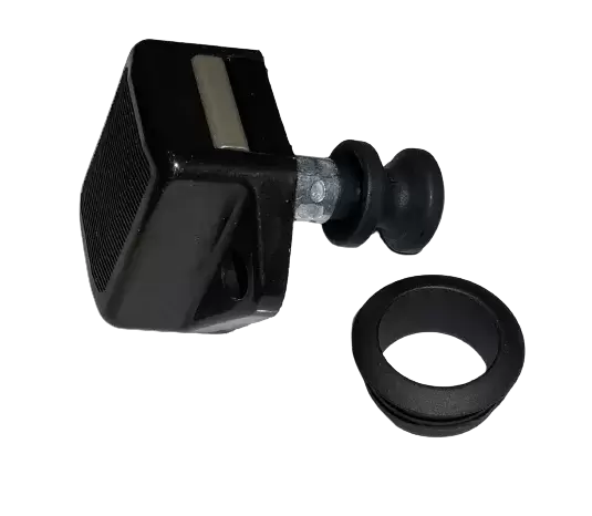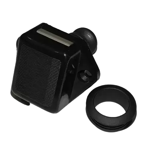 Cierre pulsador mini negro con roseta para cajones y armarios de caravanas, autocaravanas y camper.