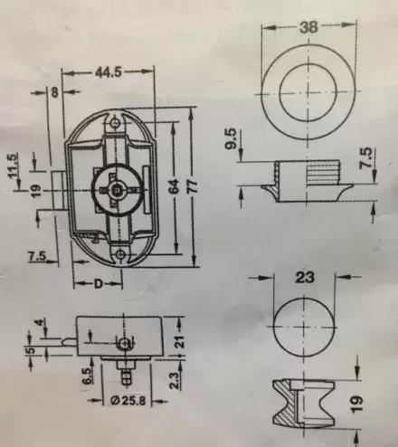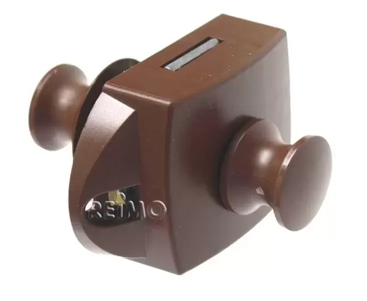 Cierre pulsador con roseta y mecanismo en color marron, medidas en foto adjunta.