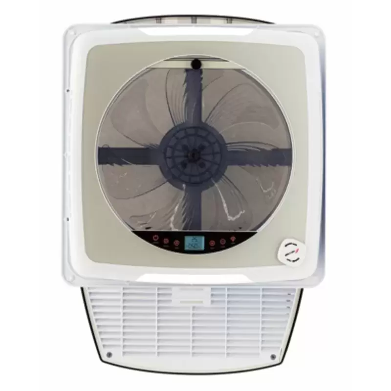 Claraboya con ventilador tipo Maxxfan con tapa externa color blanca, caravana, autocaravana y camper.