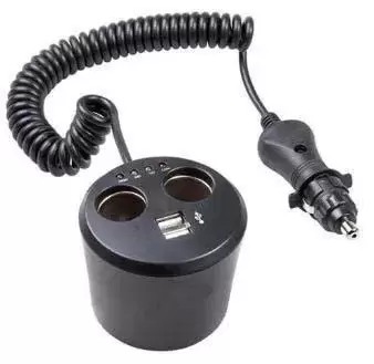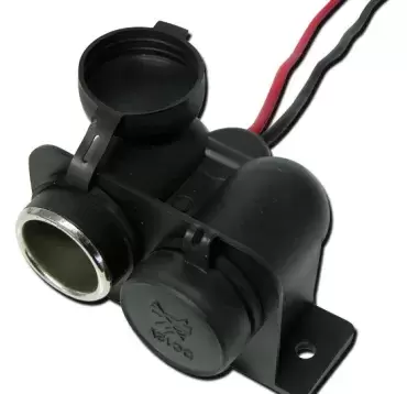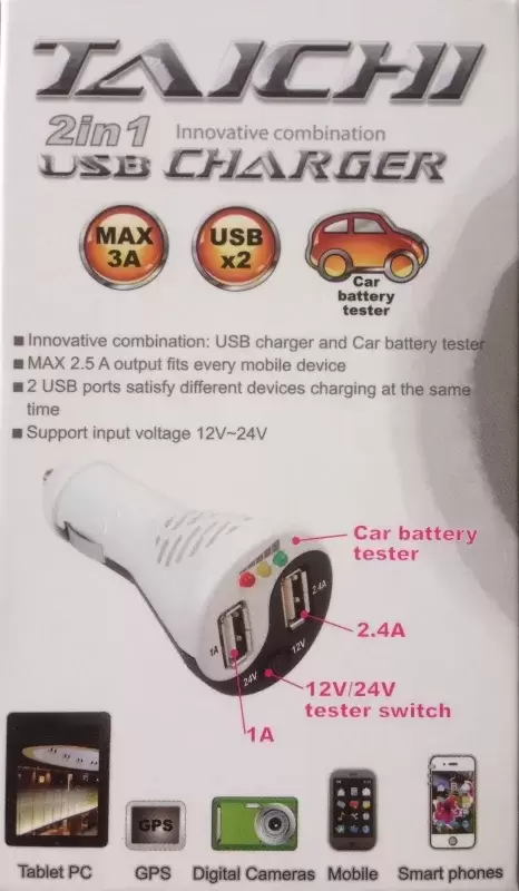 Conector para toma de mechero marca TITAN con dos salidas USB y test de carga de batería, apto para 12 ó 24 voltios, capacidad maxima de carga 3 ah.