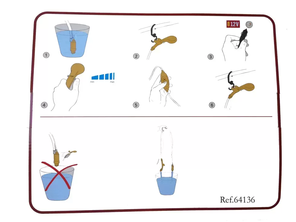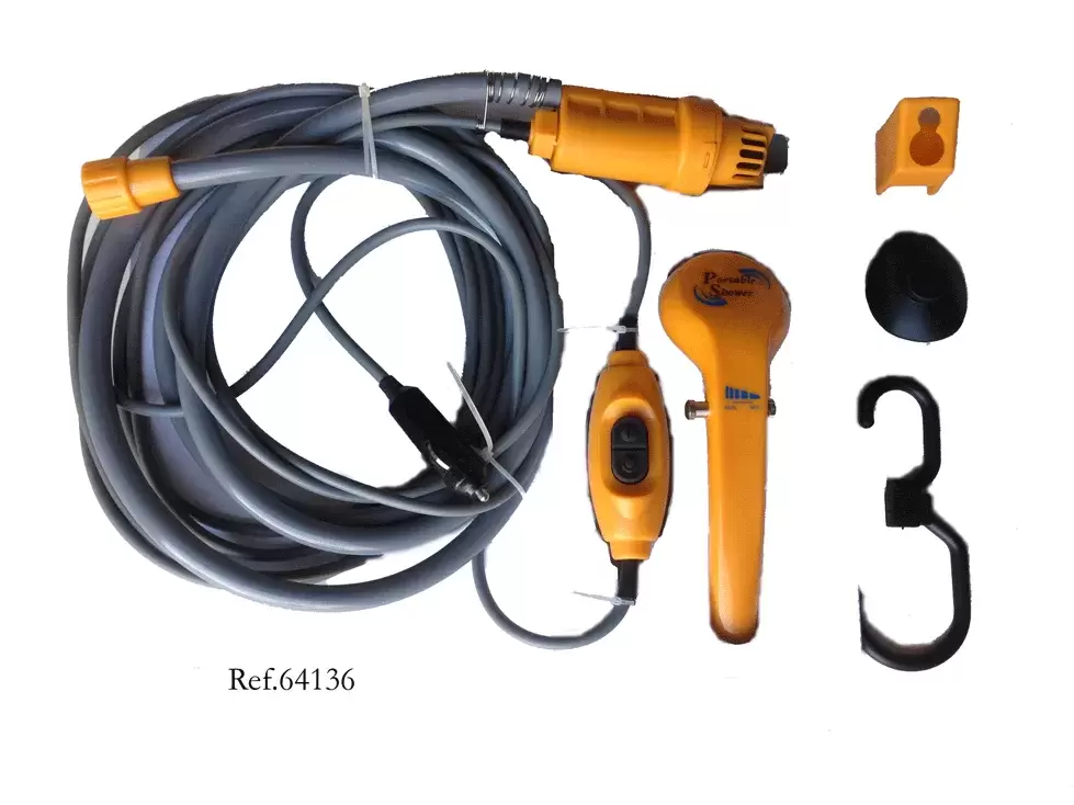 Ducha portatil inprescindible en el camper y recomendable en autocaravana por sus multiples posibilidades de uso, con ascesorios para poder colgar con ventosa en la pared y gancho para colgar la ducha donde quieras, conexión a 12v interruptor de encencido y apagado y bolsa de transporte y almacenaje.
