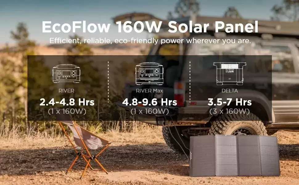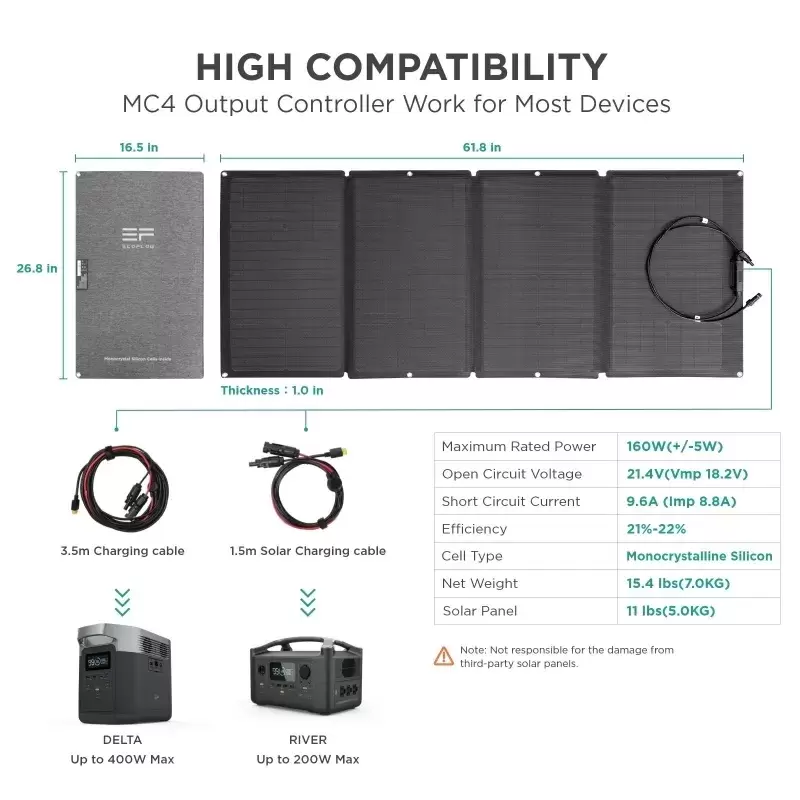· Portátil y plegable. El panel solar EcoFlow de 160 W es portátil, plegable y compacto, y pesa solo 7 kg. Desde acampar hasta actividades al aire libre, despliegue el panel solar y comience a capturar energía solar en segundos.