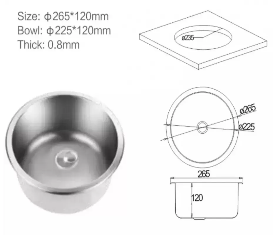 Fregadero redondo de acero inoxidable 265x265 para caravanas, autocaravanas y camper. - Ref. GR-577B