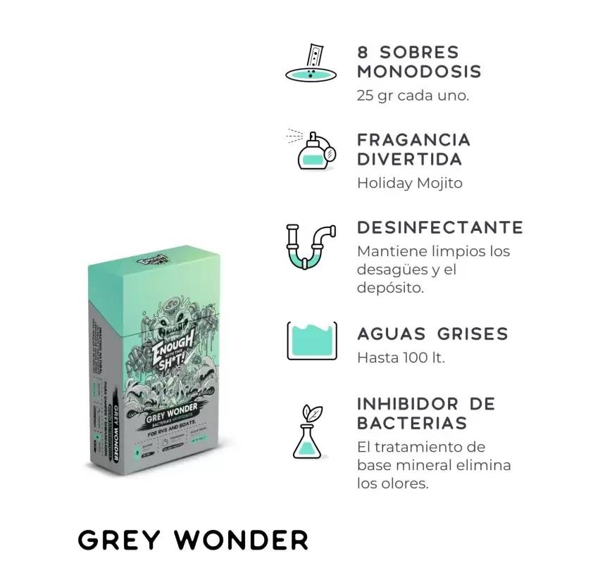 Grey Wonder es una solución bacteriostática que transforma tu depósito de aguas grises en una fortaleza contra las bacterias causantes de malos olores. Este no es un producto de limpieza cualquiera, es un inhibidor bacteriano que dejará tu depósito de aguas grises y desagües perfectamente limpios sin necesidad de biocidas o productos químicos tóxicos.
