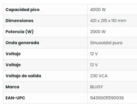 Inversor 12V 2000W onda sinusoidal pura con función by-pass BLUGY para caravana, autocaravana y camper.