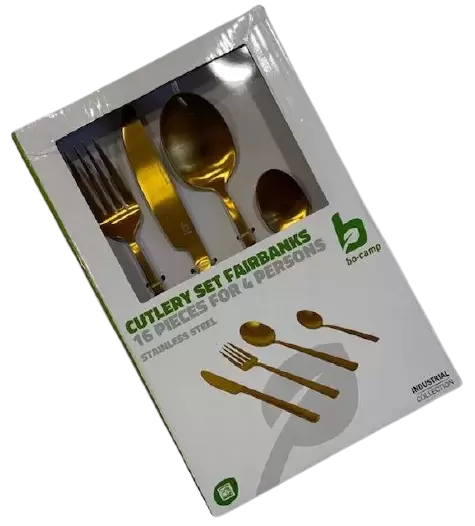 Juego de cubiertos 16 piezas en acero inoxidable color ORO, camping caravaning y overland.