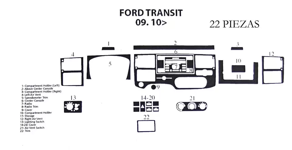 Kit dec. salpicadero Ford Transit 09-2010> efecto madera 22pzs. - Ref. CRU203