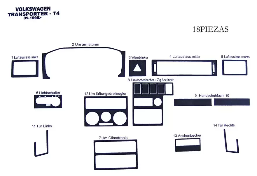 Kit decoración para salpicadero para VW transporter T4 de Septiembre de 1998 en adelante.
