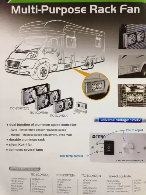 Maxima calidad para refrigerar la parte trasera de su frigorífico, con ventiladores de 9 cm. de funcionamiento silencioso, montados en un chasis de aluminio, con soportes tambiem de aluminio para multitud de posiciones de anclaje, dispone de un sensor de temperatura para funcionamiento en modo automático, gracias al cual la velocidad de funcionamiento sube al tiempo que la temperatura, posibilidad de funcionamiento manual, con regulador de la velocidad de los ventiladores, panel de control fabricado en aluminio que se puede instalar tanto en superficie como empotrado.