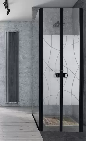 Mampara de alta calidad, perfiles en color negro, biselado elegante y moderno.