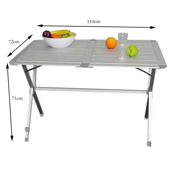 Mesa de aluminio Midland para cuatro personas que se puede desmontar y almacena en un saco con unas medidas de 110 de largo x 22 de diámetro.