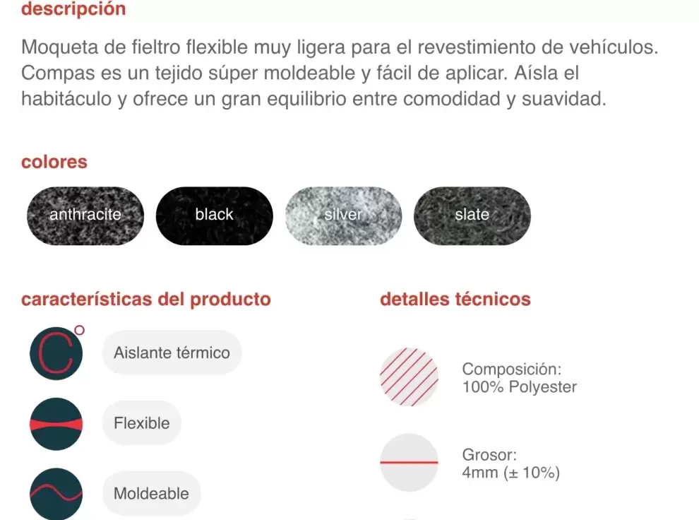 Moqueta de fieltro flexible muy ligera, es un tejido súper moldeable y fácil de aplicar, aísla el habitáculo y ofrece un gran equilibrio entre comodidad y suavidad..