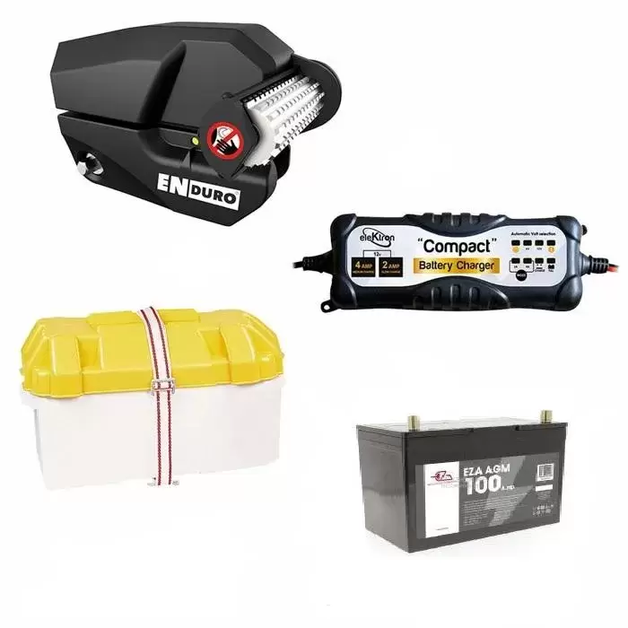-El mover está provisto de dos motores para las ruedas, todos los herrajes para su instalación, la centralita que dirige todo el sistema, una batería de AGM, una caja para guardar la batería, cargador de batería inteligente, mando de control remoto y desconectador de todo el sistema con caja para instalar en el panel sádnwich de la caravana.