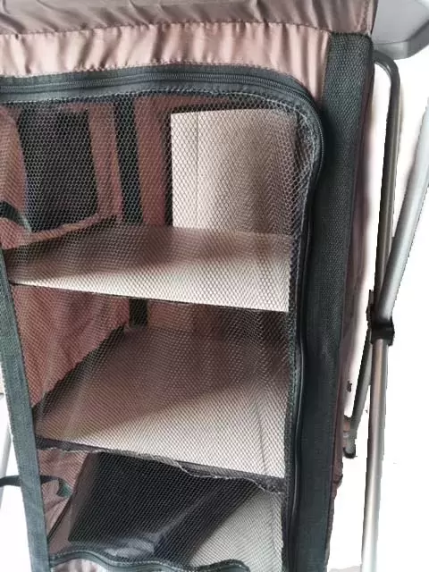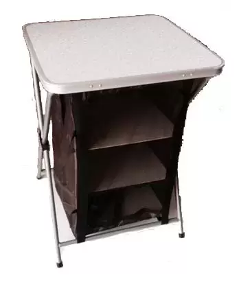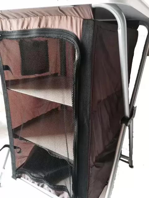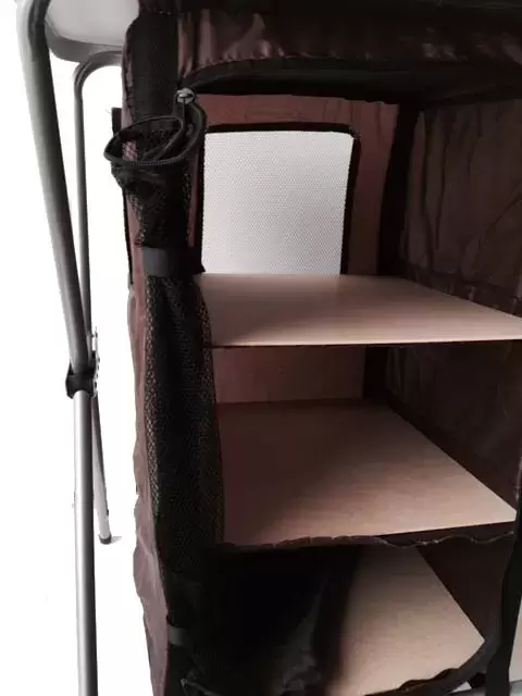Mueble de cocina económico con tres baldas , puerta mosquitera enrrollable trasera también mosquitera, bolsillos laterales, estructura metálica y mesa con marco de aluminio.