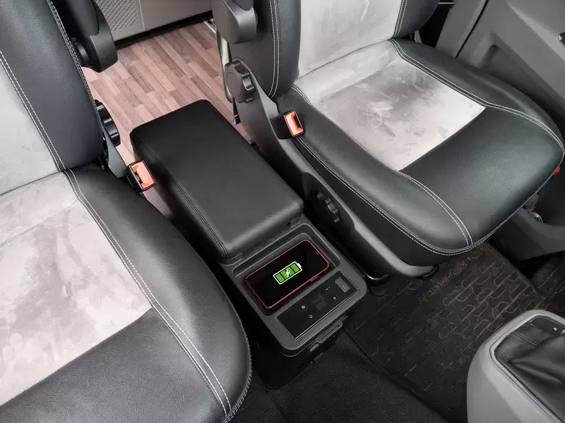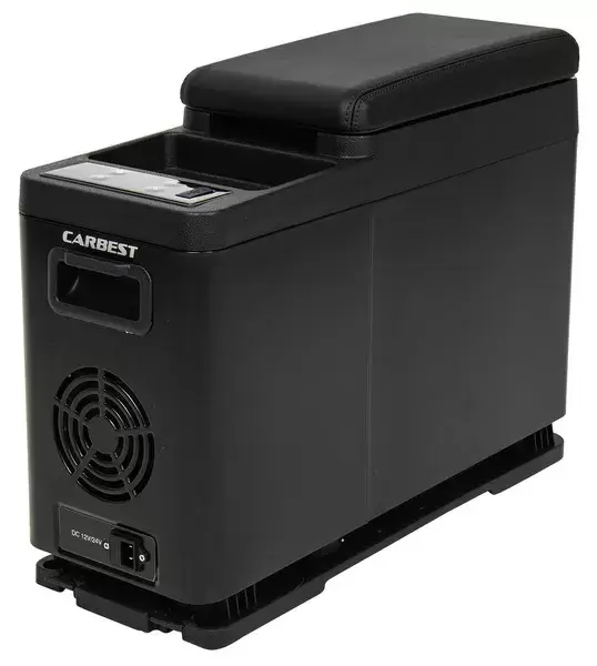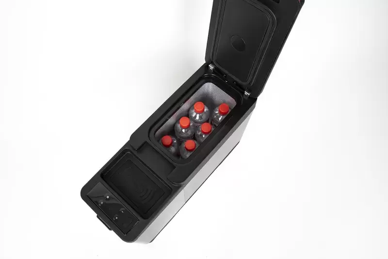 La consola central multifuncional con nevera de compresor integrada de 12 V / 24 V viene con una placa de montaje separada, que permite una fijación rápida y sencilla en el vehículo. La tapa del compartimento de la nevera está cubierta con imitación de cuero, las costuras decorativas proporcionan un aspecto elegante.