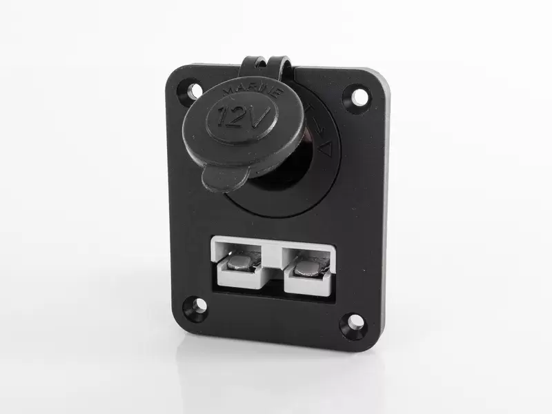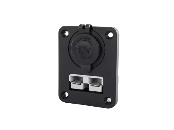 Panel con toma de 12V hembra mas conector hembra de 50AH tipo Anderson para caravanas, autocaravanas, camper y 4x4 overland.