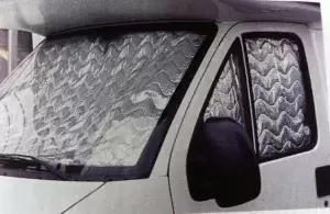 Oscurecedores termicos para autocaravanas con cabeza Iveco Daily del del año 2000 al 2006 , el kit contiene los protectores para las dos ventanillas y para el parabrisas, bolsa de transporte y ventosas.