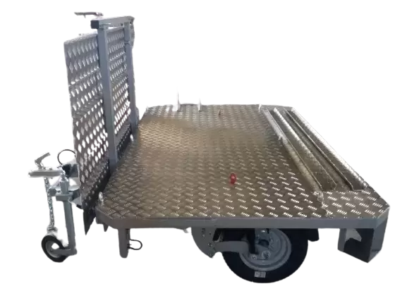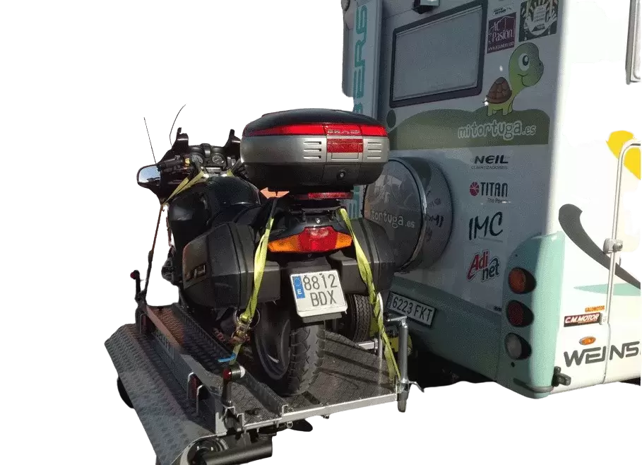 Remolque transversal con sistema de ruedas giratorias 360º y sistema de enganche de bola con bloqueo, con lo que maniobrar no reviste ningún problema ya que el remolque permanece rígido con el conjunto de la autocaravana y son las ruedas las que giran, remolque adaptable a cualquier tipo de enganche que ya tenga adaptado en su vehículo.