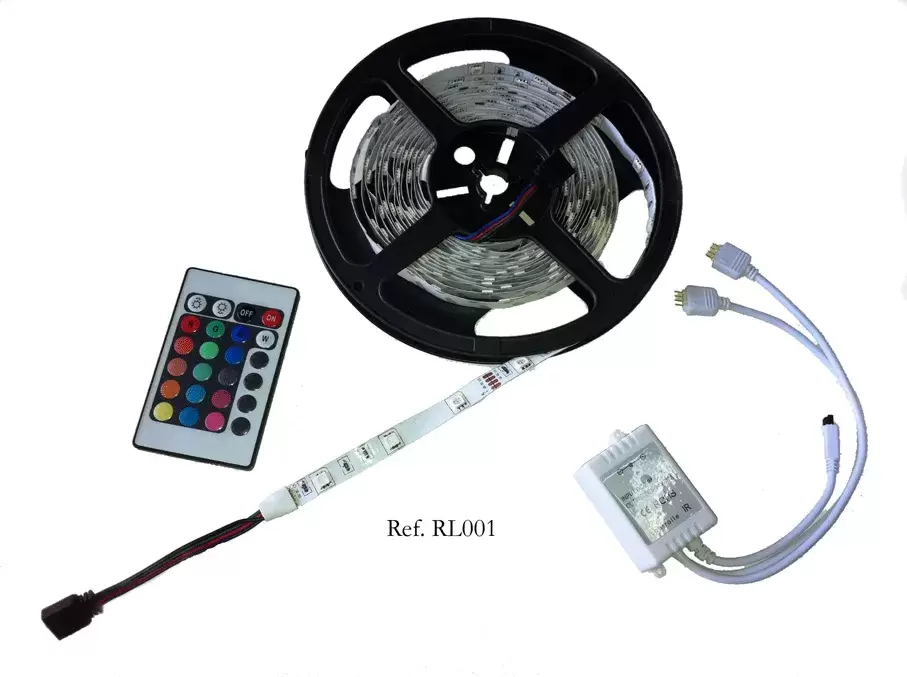 Rollo de led de 5 metros de largo, recubrimiento en silicona resistente al agua para montar tanto en interir como exterior con mando a distancia para seleccionar el color de la luz.