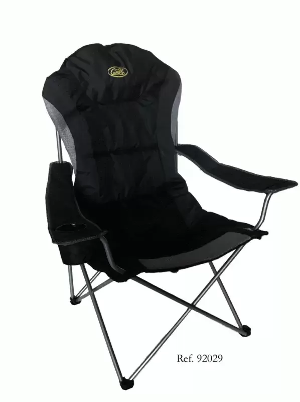 Silla de generosa dimensiones con estructura metálica muy resistente y loneta de gran calidad 100% Polyester (600D) y cinchos de refuerzo, dispone de bolsillo con cabezal de cierre con cremallera,alojamiento con recubrimiento termico para depositar vaso o lata de bebida y se guarda en bolsa de transporte una vez plegada.