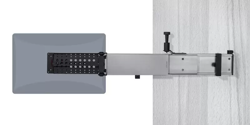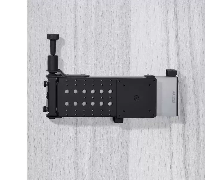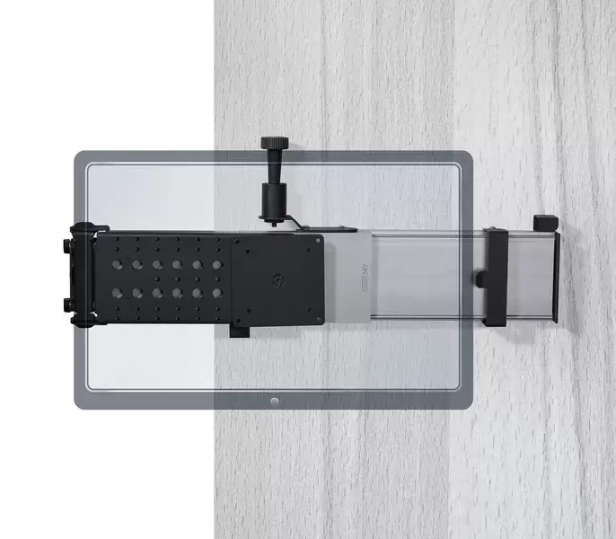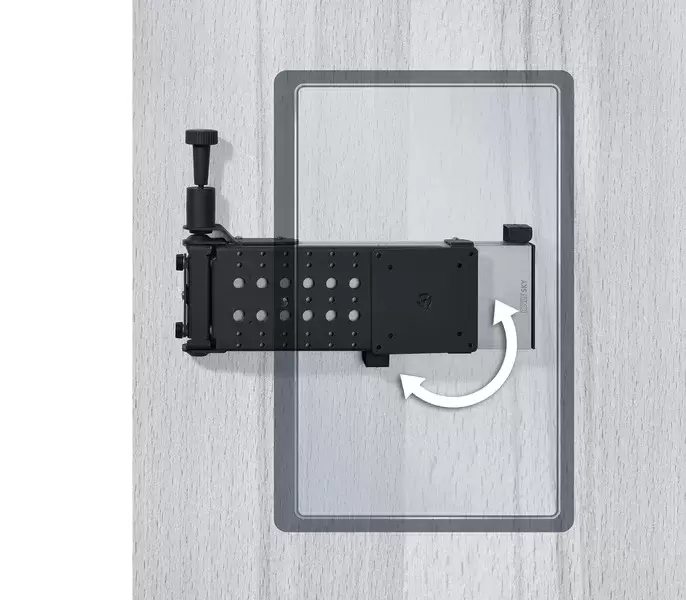 Soporte de pared TFT SKY 20W (VESA 75+100). Extensión con palanca de bloqueo para asegurar la pantalla durante la conducción. Incluye guía de cable. Dependiendo de la situación de instalación, la pantalla se puede girar opcionalmente 90° para lograr una profundidad de instalación más pequeña. La pantalla se puede girar hasta 180° cuando está extendida.