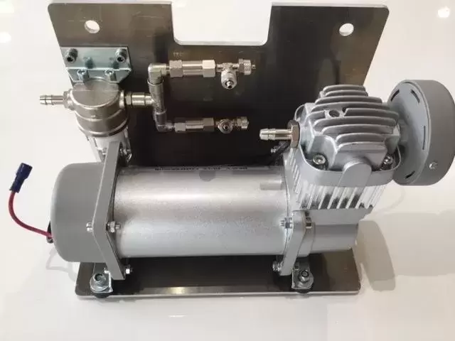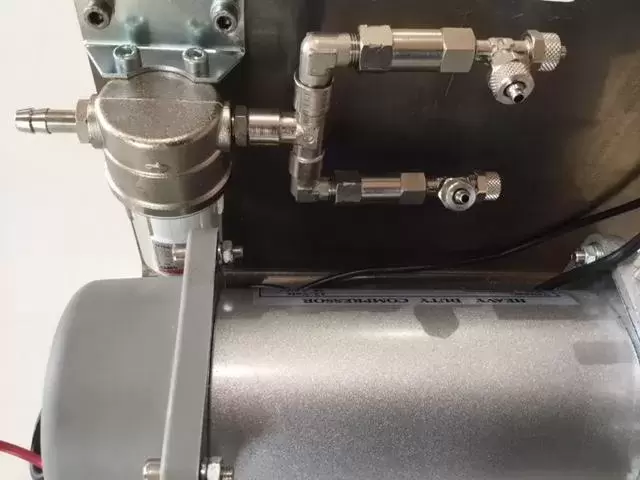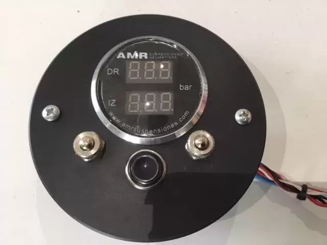 Panel de control compuesto por un pulsador para poner en marcha el compresor, dos manómetros DIGITALES para visualizar cada presión, este sistema te permite una ayuda a nivelar la autocaravana o camper en estacionamiento teniendo mas presion en una balona que en otra, una vez seguimos nuestra marcha no es necesario desinflar la otra balona y volver a meter presión, su sistema de válvulas nivela las dos con la misma presión.
