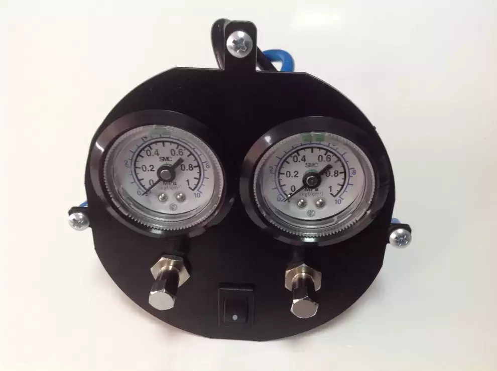 Panel de control compuesto por un pulsador para poner en marcha el compresor, dos manómetros analógicos para visualizar cada presión, este sistema te permite una ayuda a nivelar la autocaravana o camper en estacionamiento teniendo mas presion en una balona que en otra, una vez seguimos nuestra marcha no es necesario desinflar la otra balona y volver a meter presion, su sistema de valvulas nivela las dos con la misma presión.