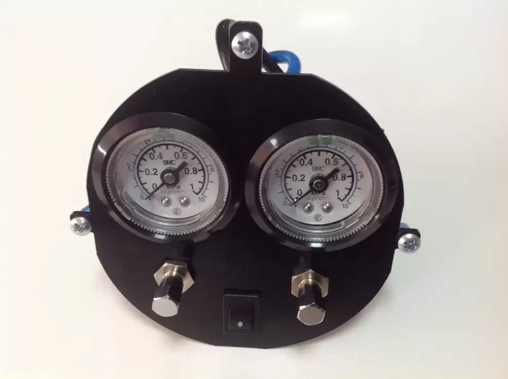 Panel de control compuesto por un pulsador para poner en marcha el compresor, dos manómetros analógicos para visualizar cada presión, este sistema te permite una ayuda para nivelar la autocaravana o camper en estacionamiento teniendo más presión en una balona que en otra. Una vez seguimos nuestra marcha no es necesario desinflar la otra balona y volver a meter presión, su sistema de válvulas nivela las dos con la misma presión.