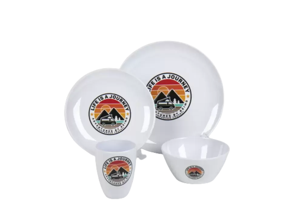 Vajilla de melamina "LA VIDA ES UN VIAJE" - para 4 personas, caravana, autocaravana, camper y 4x4 overland.