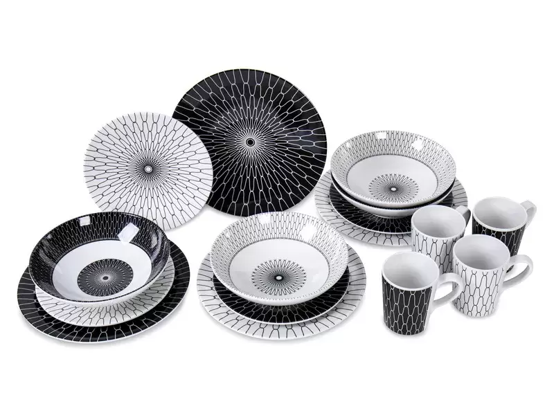 Vajilla de melamina premium en blanco y negro para 4 personas, 16 uds, camping caravaning.
